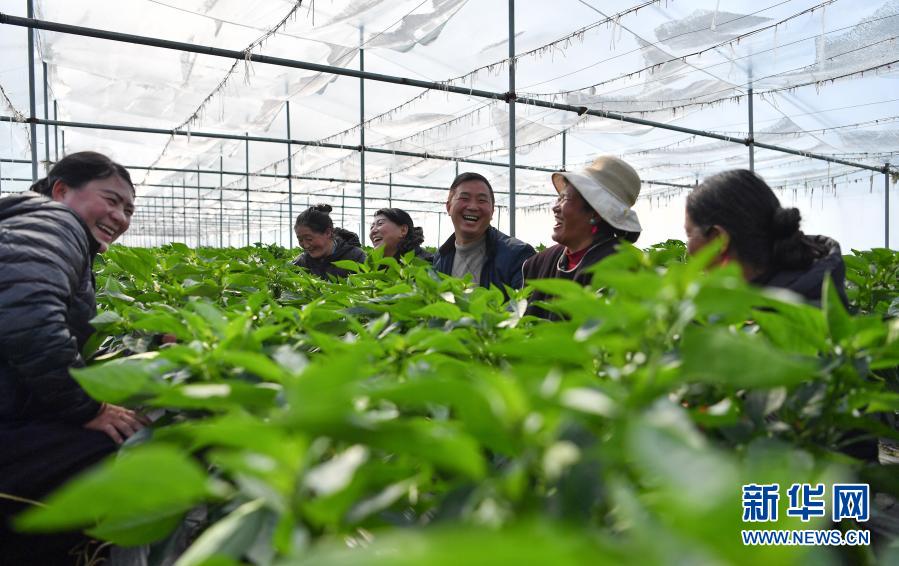 陳千(中)和種植戶在大棚里查看蔬菜長勢(shì)(2月25日攝)。新華社記者 晉美多吉 攝