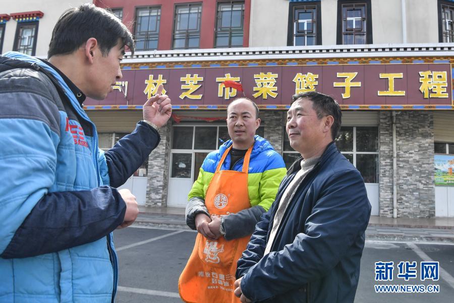 陳千(右)和林芝市菜籃子工程惠民直銷店的工作人員討論蔬菜銷售情況(2月25日攝)。新華社記者 晉美多吉 攝