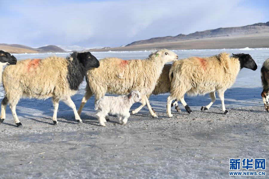 牧羊人扎西引導(dǎo)頭羊來到湖邊。他抱起一只小羊,向冰面踏出第一步,隨即羊群緩慢跟進。