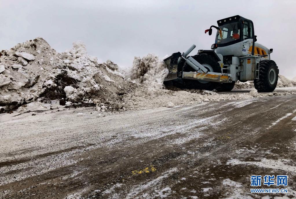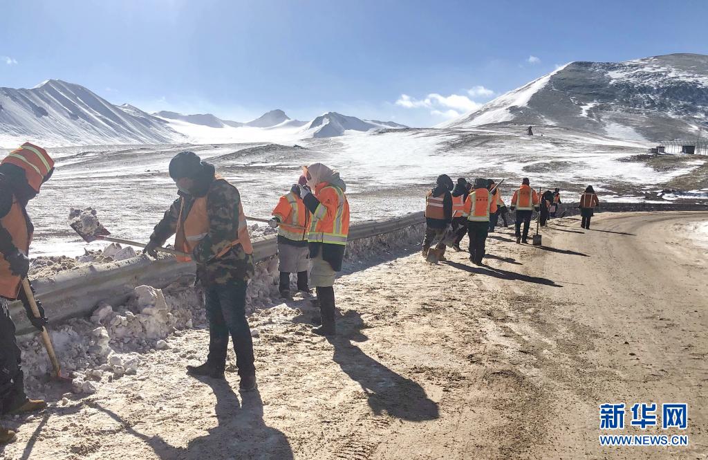 在國道109線K3363路段,安多公路養(yǎng)護段工作人員進行除雪除冰作業(yè)(2020年3月11日攝)。新華社發(fā)(后耀軍 攝)