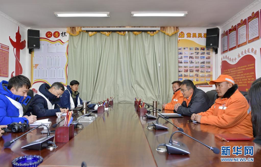 在安多公路養(yǎng)護段辦公室,扎西次仁(右一)和同事接受新華社記者采訪(1月13日攝)。新華社記者 張汝鋒 攝