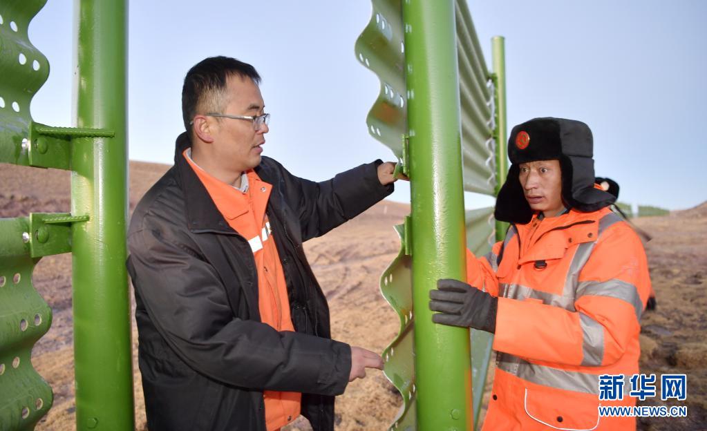 在國道109唐古拉山口處,安多公路養(yǎng)護段工作人員檢查山口的擋雪板(1月13日攝)。新華社記者 張汝鋒 攝