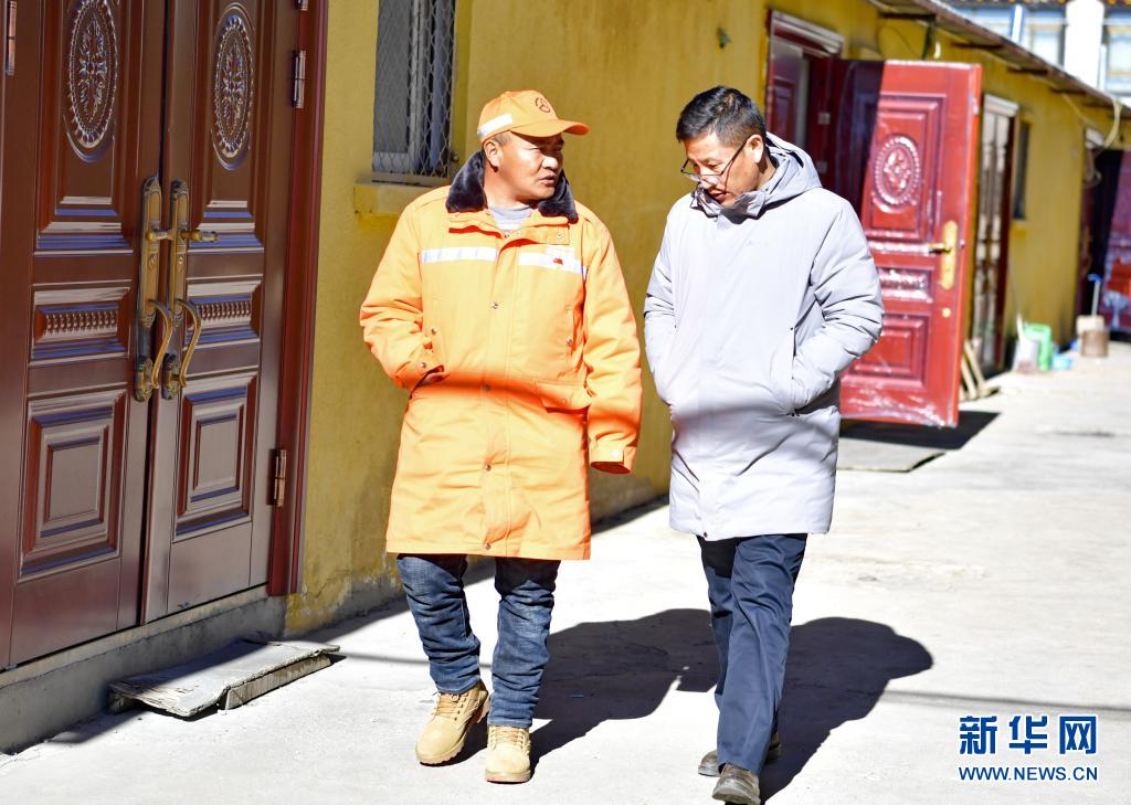 在安多公路養(yǎng)護段家屬院,扎西次仁(左)和來訪的客人交流(1月13日攝)。新華社記者 張汝鋒 攝