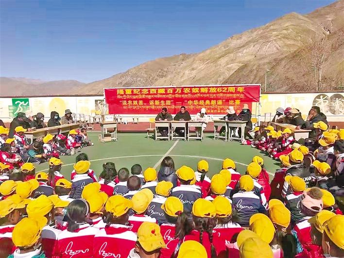 為紀(jì)念西藏百萬農(nóng)奴解放62周年,仁布縣查巴鄉(xiāng)小學(xué)開展“說農(nóng)奴苦,訴新生甜”中華經(jīng)典朗誦比賽。