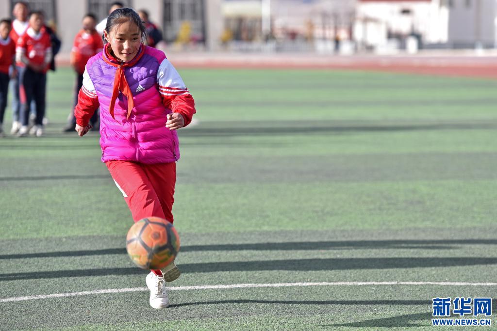 多吉卓瑪參加學校的足球興趣課(3月9日攝)。新華社記者 孫瑞博 攝