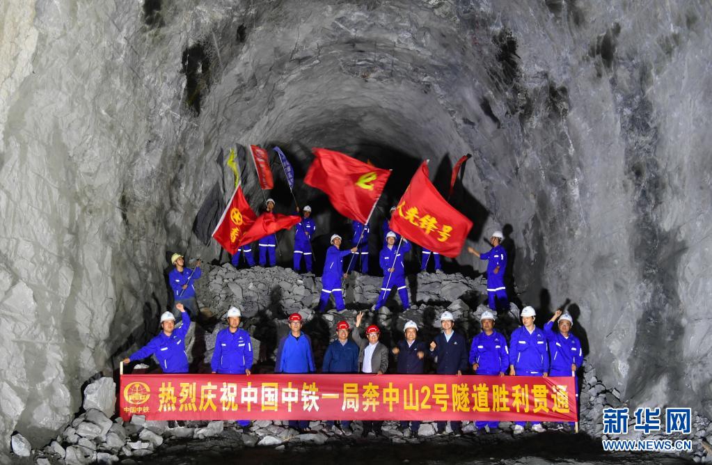 施工人員慶祝川藏鐵路拉林段重難點工程奔中山二號隧道順利貫通(2018年8月21日攝)。新華社記者 晉美多吉 攝