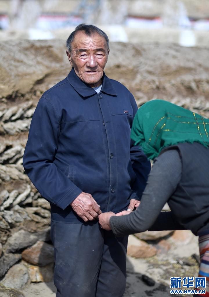 女兒帕珠在幫父親旦達(dá)老人整理衣服(4月16日攝)。新華社記者 覺果 攝