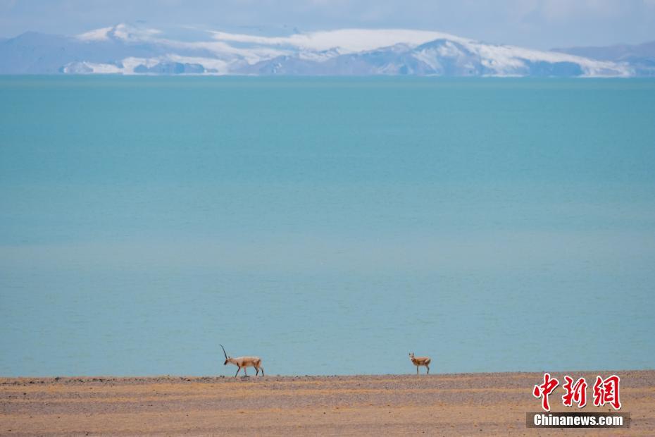 5月2日,西藏羌塘草原色林錯湖邊的藏羚羊。