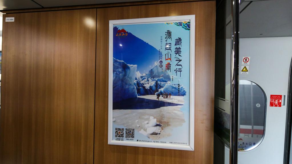 從站臺開始,醒目的車身外彩貼盡入乘客眼中,由此,山南文化旅游的元素就將伴隨乘客的整段旅程。全列車廂,雍布拉康、昌珠古寺、桑耶古鎮(zhèn)、羊卓雍措等旅游目的地與“藏美之行 源起山南”“世界之巔在西藏 西藏之源在山南”等旅游口號互相輝映,將山南歷史文化與盛景濃縮其中,呈現(xiàn)在旅客面前,讓大家近距離感受山南迷人的美景和悠遠(yuǎn)的歷史。
