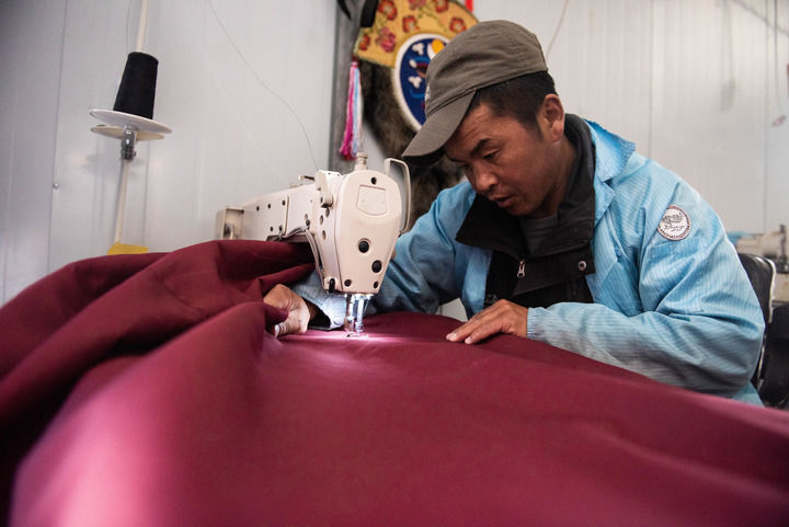 走進廠房,只能聽見縫紉機轉(zhuǎn)動的聲音。平措占堆坐在縫紉機前,雙眼盯著跳動的針頭,手推深紅色布料伸展開去,這是制作藏式門簾的步驟之一。