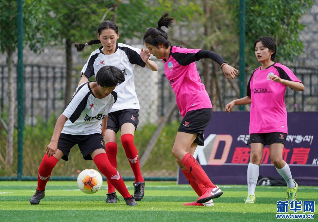 在拉薩首次舉辦的民間女子足球比賽——“亞克杯”女子足球賽上,雪域女足隊(duì)隊(duì)員次卓瑪(白)試圖突破另類女足隊(duì)(粉)的防線(2020年7月23日攝)。新華社記者晉美多吉 攝