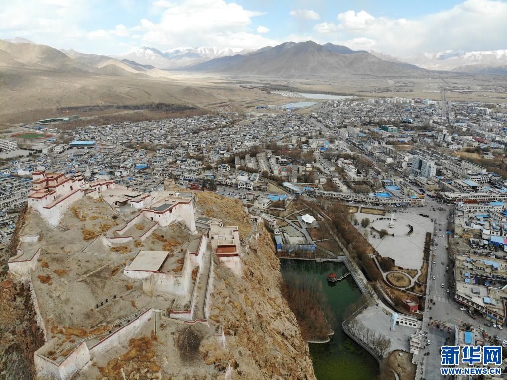 這是3月23日拍攝的江孜宗山古堡和江孜縣城(無人機照片)。新華社記者 孫瑞博 攝