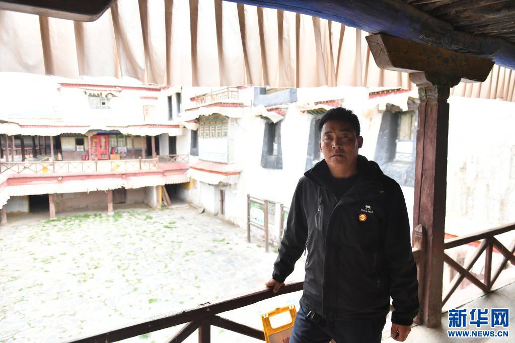 5月10日,解說員普布次仁站在帕拉莊園二樓的走廊上。新華社記者 孫瑞博 攝