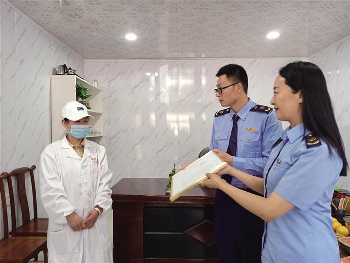 工作人員向商家負(fù)責(zé)人發(fā)放登記證。