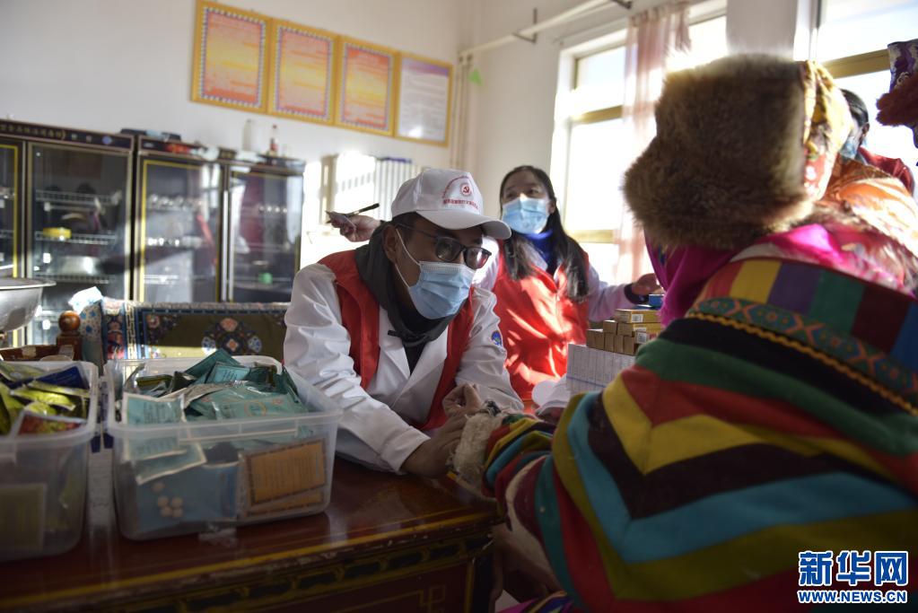 西藏尼瑪縣新時代文明實踐中心志愿者在尼瑪縣五保集中供養(yǎng)服務(wù)中心進(jìn)行義診(2021年2月3日攝)。新華社記者 格桑朗杰 攝