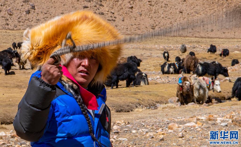在西藏日喀則市定日縣扎西宗鄉(xiāng)藏普村的牧場里,牧民扎西正在趕牦牛(2020年4月23日攝)。新華社記者 孫非 攝