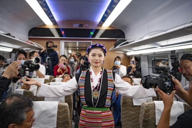 西藏首列復(fù)興號(hào)的列車員在進(jìn)行當(dāng)?shù)胤棻硌?6月25日攝)。 新華社記者 普布扎西 攝