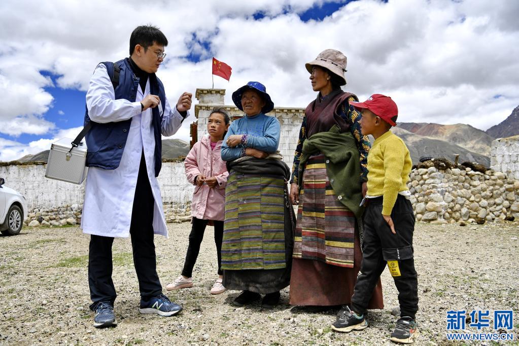在拉薩市當雄縣格達鄉(xiāng)格達村,前來義診的王克明(左一)為村民講解健康知識(6月19日攝)。新華社記者 張汝鋒 攝