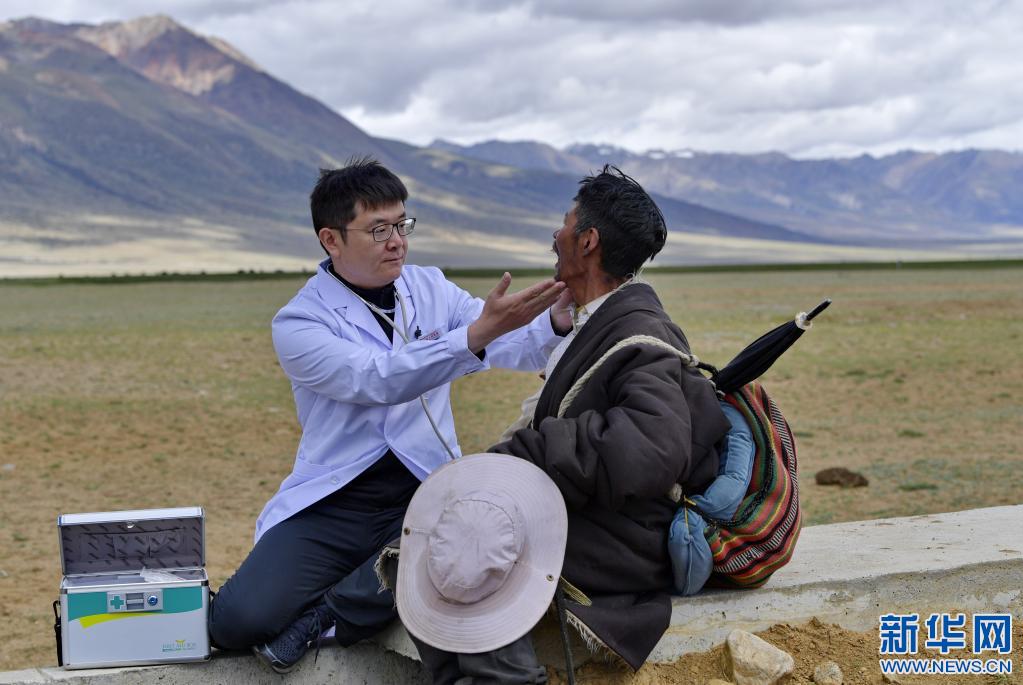 王克明(左)在西藏當雄縣格達鄉(xiāng)格達村牧場為牧民義診(6月19日攝)。新華社記者 張汝鋒 攝