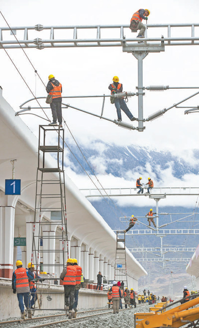 4月1日,中鐵電氣化局集團技術工人在林芝火車站進行接觸網(wǎng)精調(diào)作業(yè)。焦宏濤攝(新華社發(fā))