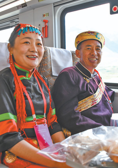 6月25日10時30分,一輛復興號高原內(nèi)電雙源動車組駛出拉薩火車站,駛向林芝市。圖為乘坐復興號的乘客。新華社記者 晉美多吉攝