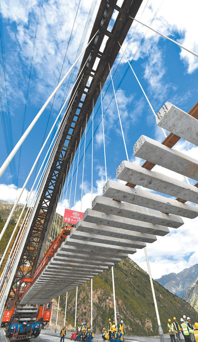 2020年9月20日,中鐵十一局工程技術人員在拉林鐵路藏木特大橋上鋪軌。新華社記者 覺 果攝