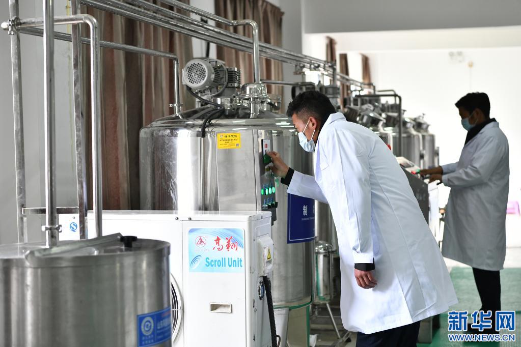 工作人員在西藏娘亞牦牛養(yǎng)殖產(chǎn)業(yè)發(fā)展有限責(zé)任公司的酸奶生產(chǎn)車間作業(yè)(7月28日攝)。新華社記者 李鑫 攝