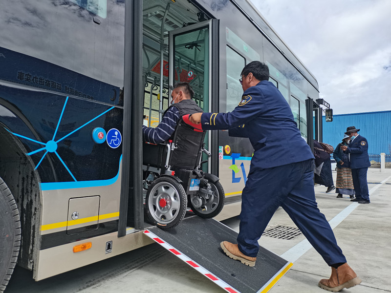3日,拉薩市公交運(yùn)營(yíng)有限公司舉行拉薩公交經(jīng)開區(qū)B區(qū)公交首末站啟用暨大站快線開通儀式?,F(xiàn)場(chǎng),坐在輪椅上的市民覺列準(zhǔn)備乘坐新公交車,駕駛員接到乘車提示后,采取制動(dòng)措施,將車輛熄火后來到后門處,將無障礙踏板翻開并固定好,順利幫其上車。
