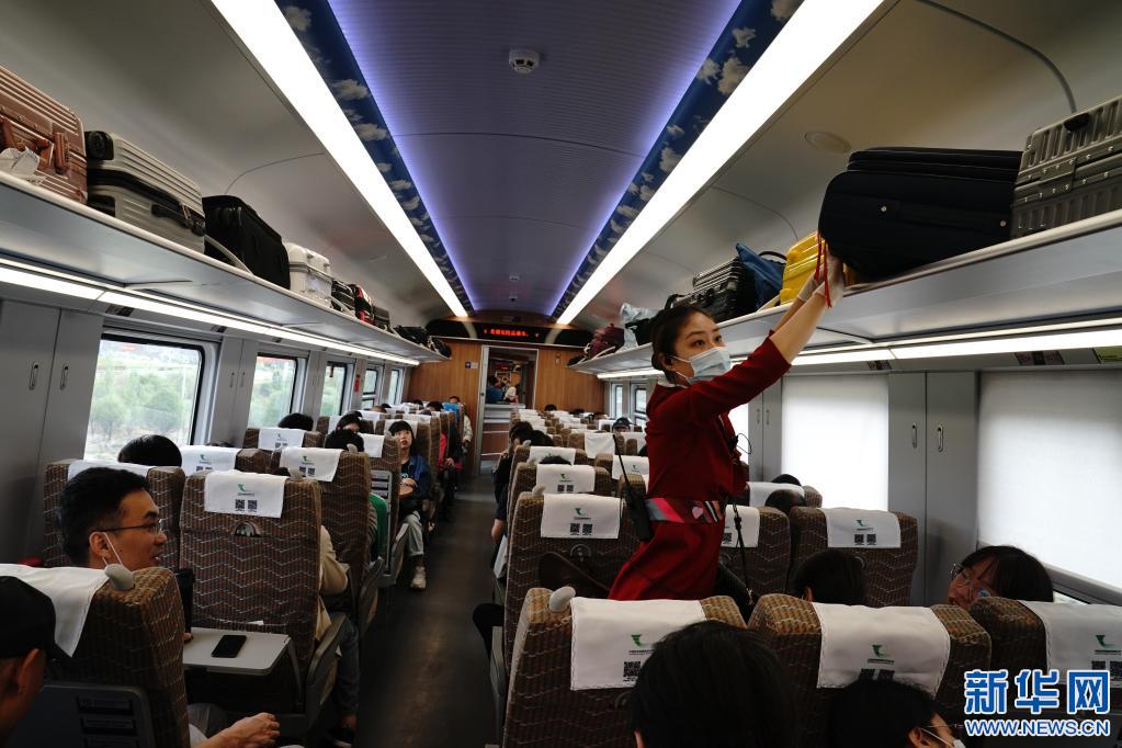 拉林鐵路復(fù)興號(hào)列車乘務(wù)員正在為旅客整理行李(2021年7月8日攝)。新華社記者 劉洪明 攝