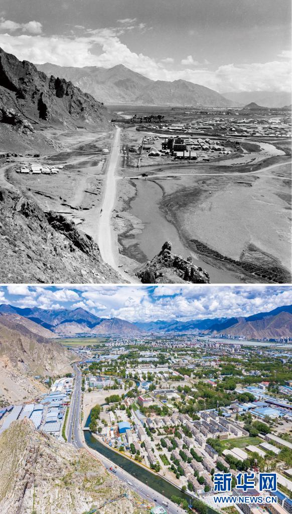 拼版照片:上圖是20世紀(jì)60年代拍攝的拉薩市西郊景象(新華社發(fā) 藍志貴攝);下圖是2021年8月9日拍攝的拉薩市西郊新貌(新華社記者普布扎西攝,無人機照片)。新華社發(fā)