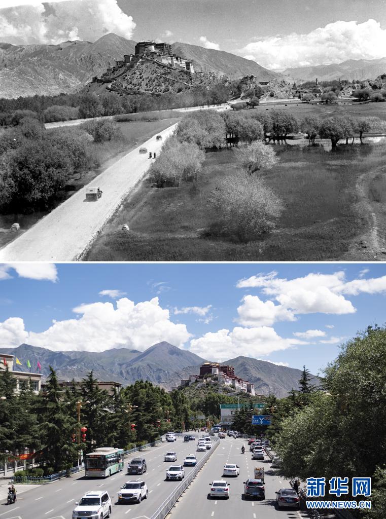 拼版照片:上圖是20世紀(jì)50年代,汽車通過市郊公路開往布達拉宮方向(新華社記者任用昭攝);下圖是2021年8月9日,車輛穿行在通往布達拉宮的大路上(新華社記者張汝鋒攝)。新華社發(fā)