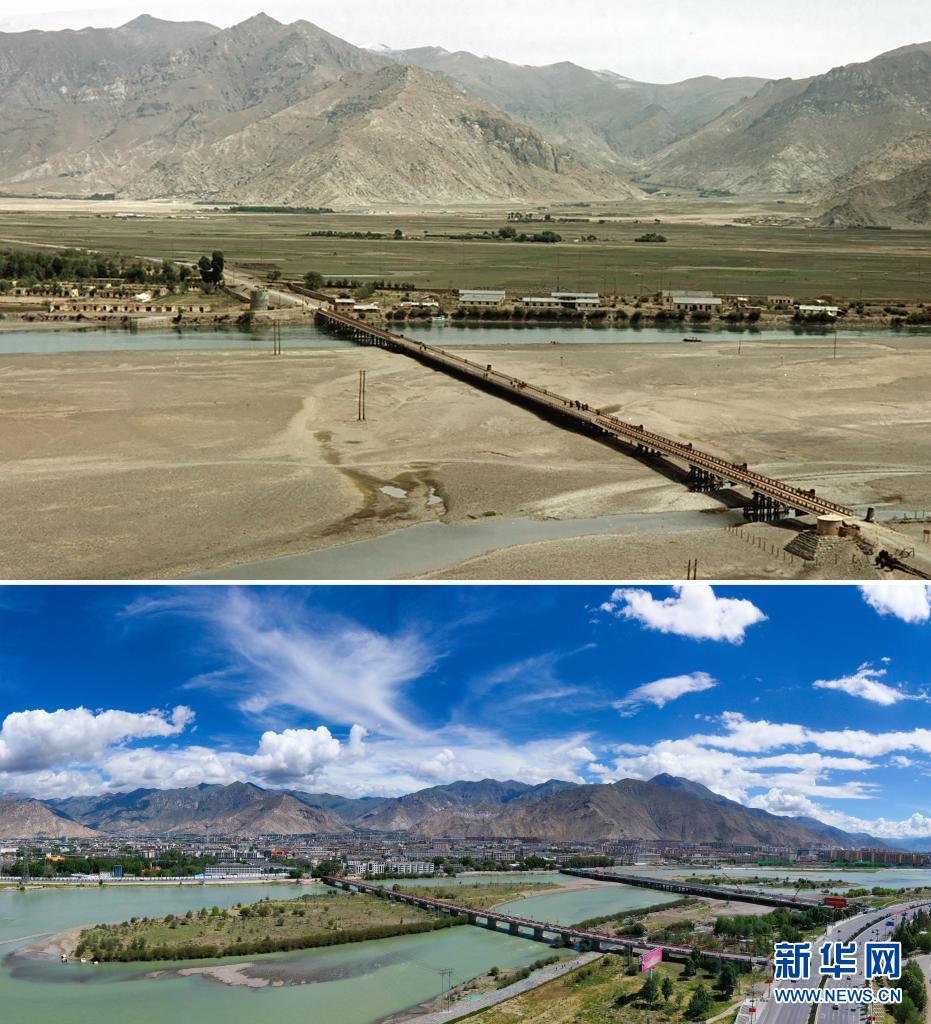 拼版照片:上圖是20世紀(jì)50年代的拉薩大橋(新華社記者王純德攝);下圖是2021年8月9日拍攝的拉薩大橋新貌(新華社記者孫非攝,無人機照片)。新華社發(fā)