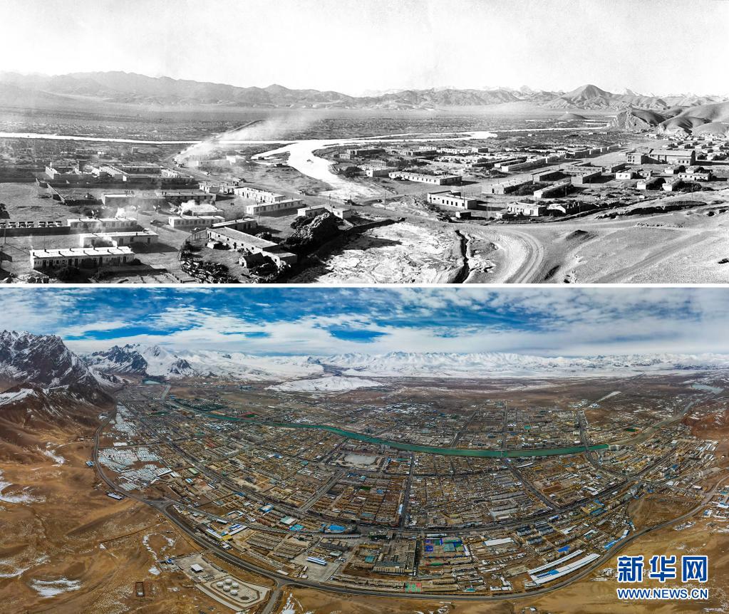 拼版照片:上圖是20世紀(jì)70年代的阿里獅泉河風(fēng)貌(新華社記者徐邦攝);下圖是2021年5月21日拍攝的阿里獅泉河鎮(zhèn)新貌(新華社記者孫瑞博攝,無人機全景照片)。新華社發(fā)