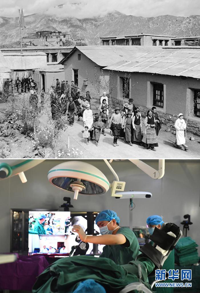 拼版照片:上圖是20世紀(jì)50年代,前往拉薩市人民醫(yī)院看病的藏族群眾在護士陪同下到醫(yī)療室去就診(新華社記者任用昭攝);下圖是2021年4月19日,拉薩市人民醫(yī)院骨科醫(yī)生通過5G通信技術(shù),在北京積水潭醫(yī)院專家遠程指導(dǎo)下使用骨科機器人開展手術(shù)(新華社記者孫瑞博攝)。新華社發(fā)