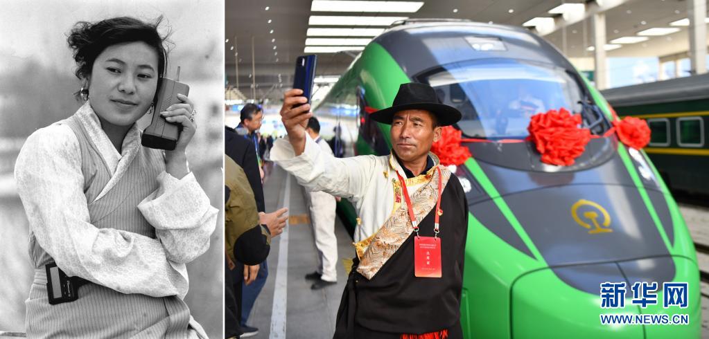 拼版照片:左圖是1994年,腰掛BP機、手持“大哥大”的藏族女商人拉珍和四川的客戶洽談生意(新華社記者土登攝);右圖是2021年6月25日,乘客與西藏首條電氣化鐵路拉林鐵路上的復(fù)興號列車自拍合影(新華社記者晉美多吉攝)。新華社發(fā)