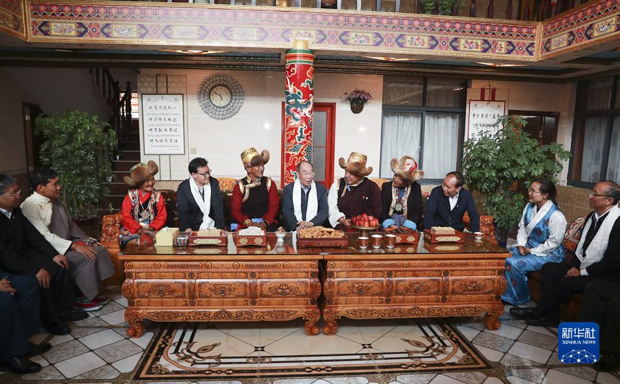 8月20日,中央代表團(tuán)山南、日喀則分團(tuán)帶著以習(xí)近平同志為核心的黨中央的深切關(guān)懷和全國人民的深情祝福,分別看望慰問當(dāng)?shù)馗髯甯鹘绺刹咳罕姟_@是中共中央書記處書記、中央統(tǒng)戰(zhàn)部部長、中央代表團(tuán)副團(tuán)長尤權(quán)率山南分團(tuán)在山南市乃東區(qū)昌珠鎮(zhèn)扎西曲登社區(qū)走進(jìn)居民次仁家看望慰問。新華社記者 丁林 攝