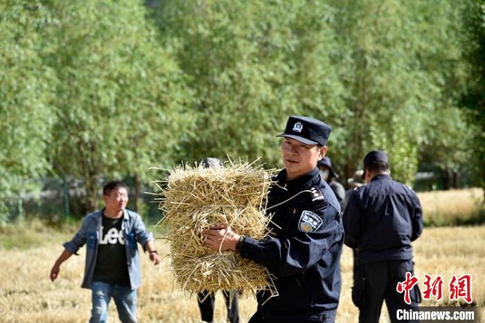 一陣忙碌過(guò)后,大家圍攏在田里聊變化說(shuō)發(fā)展。慶祝西藏和平解放70周年大會(huì)剛剛舉行,大家聊著現(xiàn)場(chǎng)觀禮、收聽(tīng)收看的感受。參加現(xiàn)場(chǎng)大會(huì)的民警高揚(yáng)向大家分享現(xiàn)場(chǎng)感受,講述自己在西藏生活學(xué)習(xí)工作22年的發(fā)展變化和入警初心。歡聲笑語(yǔ)過(guò)后,大家又忙碌起來(lái)。田間地頭藏青藍(lán)的身影,與金黃麥地構(gòu)成一幅加強(qiáng)民族團(tuán)結(jié)、警民魚(yú)水情深的動(dòng)人畫(huà)卷。