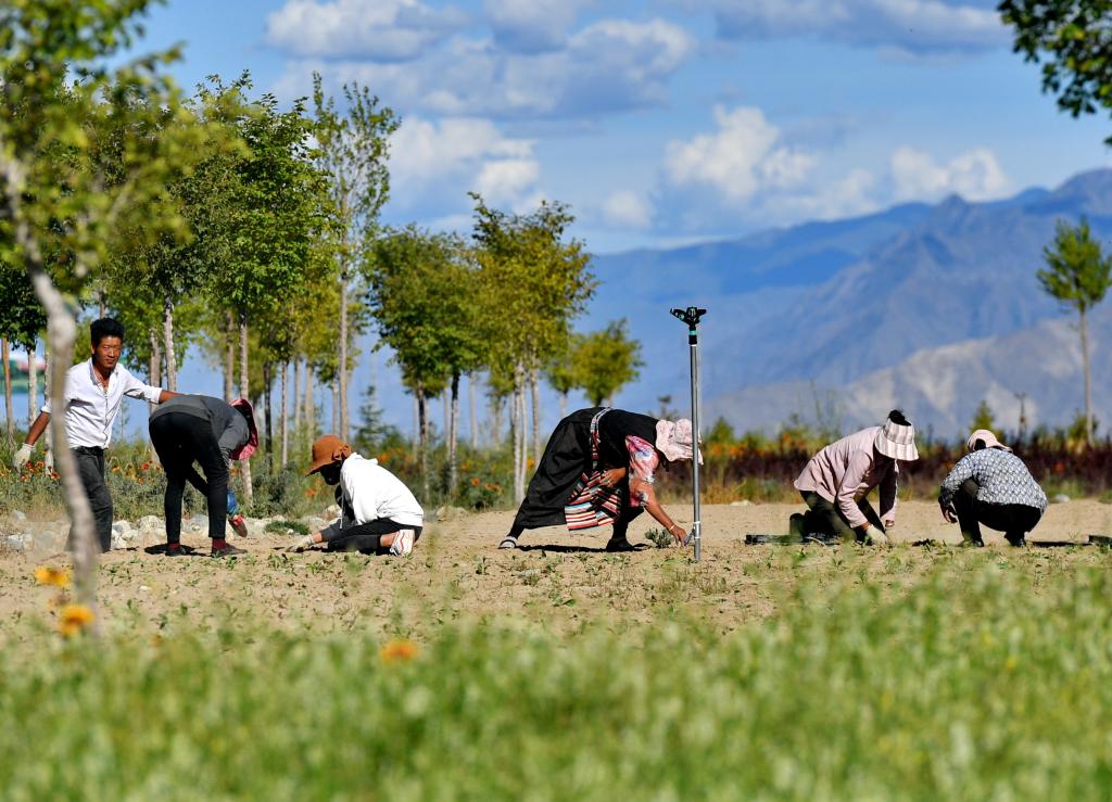當?shù)厝罕娫谏侥鲜性铱h藏草萬畝植物種苗繁育基地勞動(2019年8月29日攝)。新華社記者張汝鋒 攝