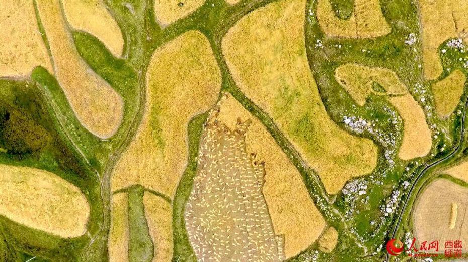 九月的西藏,已進(jìn)入青稞成熟收割時(shí)節(jié)。記者來到拉薩市曲水縣熱堆村,成片成片成熟了的青稞,金黃耀眼。村民們抓緊天氣晴好的時(shí)機(jī),互幫互助忙收割,確保顆粒歸倉。地頭田間,有的已被割倒束成捆,也有的仍在迎風(fēng)搖曳,等待收割,村民們揮舞著鐮刀,將成熟的青稞收割、扎捆、然后堆砌成一排排整齊的青稞垛子,用拖拉機(jī)將青稞運(yùn)回家,再上架晾曬,看著沉甸甸的麥穗,聞著空氣中彌漫著沁人心脾的青稞香,村民們臉上露出了喜悅的微笑。無人機(jī)鳥瞰青稞田地。人民網(wǎng) 次仁羅布攝