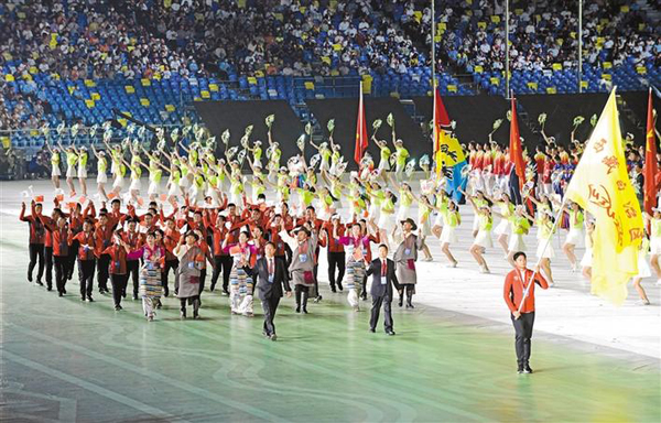9月15日晚,西藏自治區(qū)體育代表團(tuán)在入場儀式上。潘多 王莉 攝