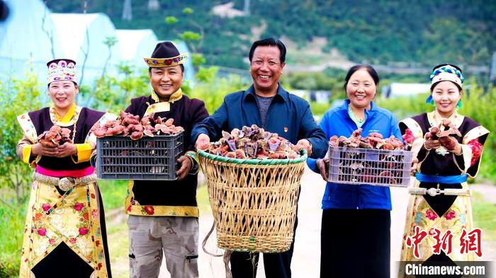 圖為米林縣農牧民手捧靈芝展示豐收的喜悅。平措旺青供圖