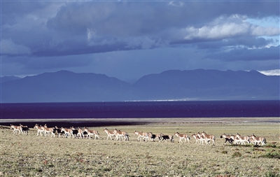 秋天的羌塘草原,從綠色撥轉(zhuǎn)到金色,秋色在這里無邊無際地蔓延,藏羚羊歡快地奔跑。