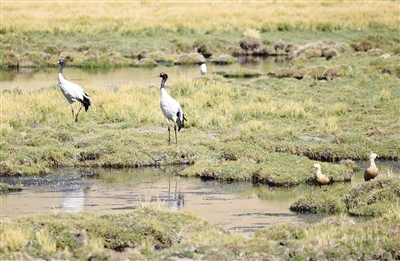 濕地上的黑頸鶴伸著長長的脖子優(yōu)雅地散步。