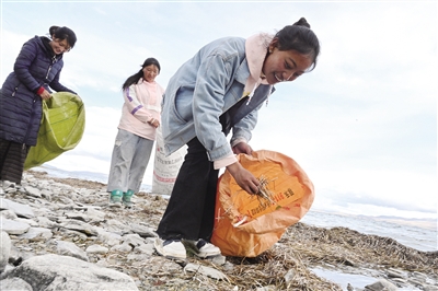 在瑪旁雍措國家級(jí)濕地自然保護(hù)區(qū)吉吾管理站,20歲的濕地保護(hù)管護(hù)員次仁旺姆和同伴在水邊撿拾垃圾。