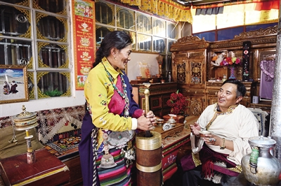 居住在阿里噶爾縣康樂新居的斯瓊正在品嘗妻子普珍制作的酥油茶。2017年,斯瓊一家從海拔4570米的改則縣麻米鄉(xiāng)搬入了噶爾縣生態(tài)安置小區(qū)康樂新居。據(jù)了解,根據(jù)西藏自治區(qū)黨委、政府的決策部署,當(dāng)?shù)卣畬?duì)海拔4700米以上極高海拔地區(qū)實(shí)施生態(tài)搬遷,實(shí)現(xiàn)群眾脫貧致富和生態(tài)環(huán)境改善。