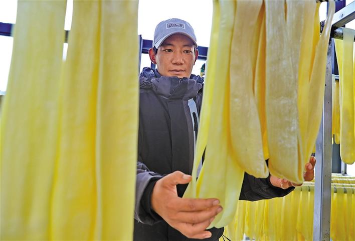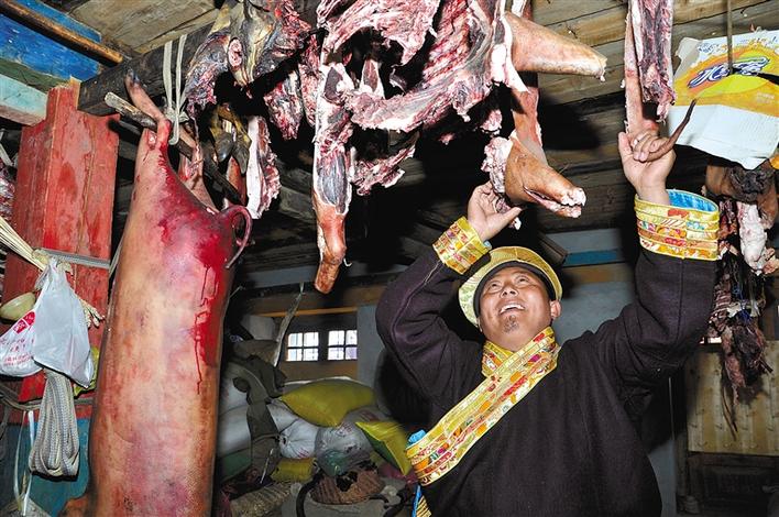 林芝市米林縣羌納鄉(xiāng)結(jié)果村村民旺杰在查看風(fēng)干肉晾制情況。王雅慧 攝