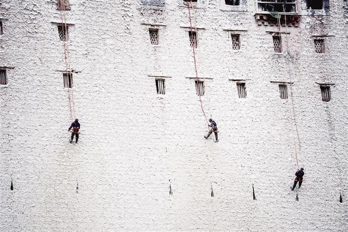 10月20日早上8點多,記者從布達拉宮西側入口進去,只見前方已經(jīng)有一大批義工背著桶,正在一步一步往上走,準備開始一天的粉刷工作。