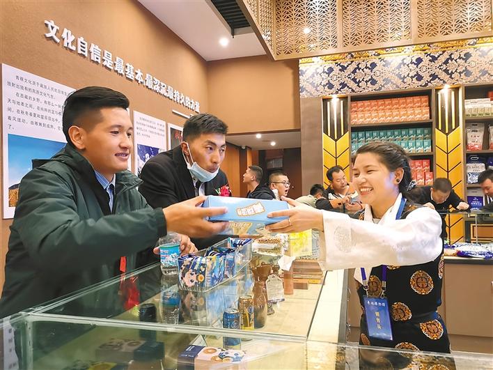 在青稞產(chǎn)品展銷區(qū),工作人員向前來參觀的客人推銷青稞產(chǎn)品。扎西頓珠 攝