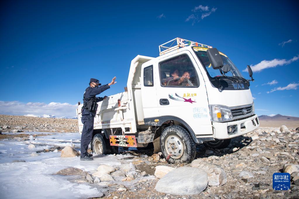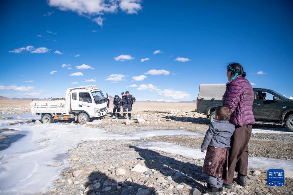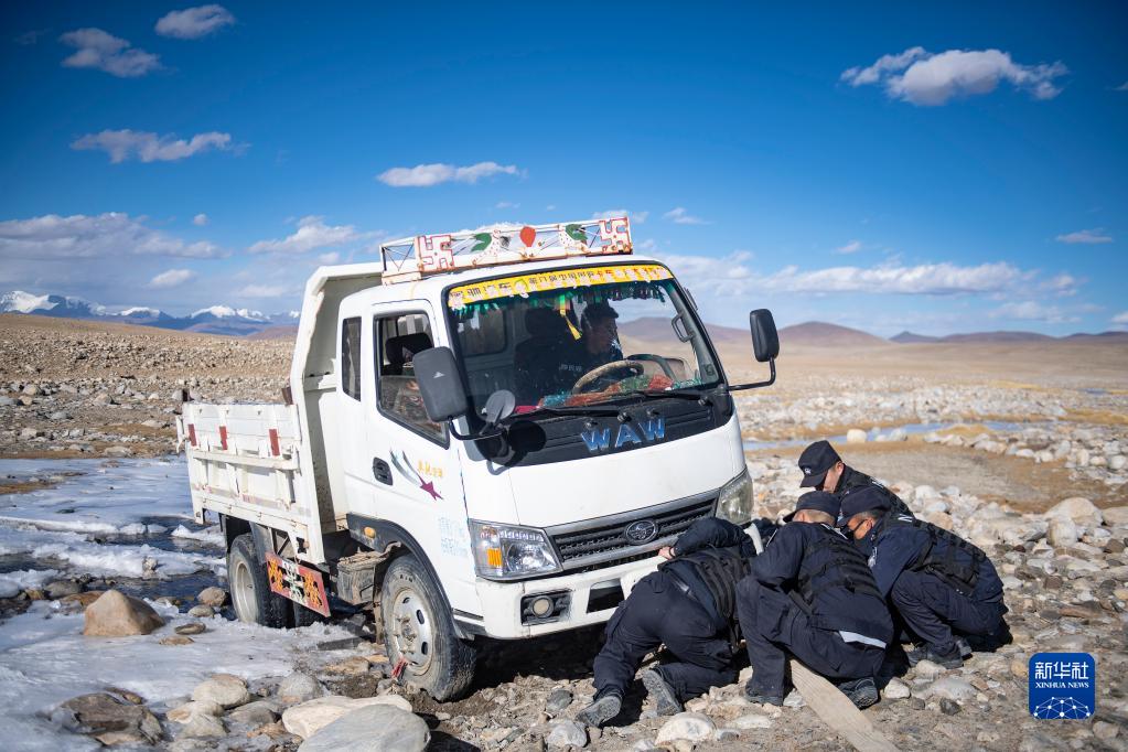 普瑪江塘邊境派出所的移民管理警察在巡邏途中協(xié)助牧民旦增多杰一家拖拽“罷工”的小貨車(chē)(11月20日攝)。新華社記者 孫非 攝