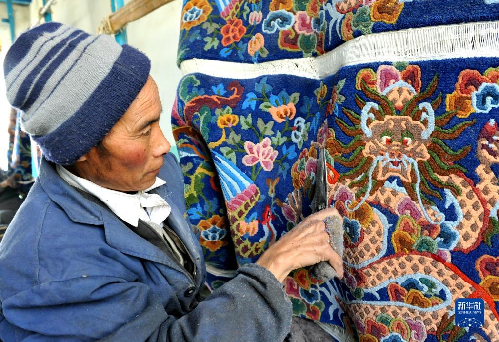 江孜昵煒藏毯廠工人正在對卡墊進行修剪。(2021年10月29日)新華社記者洛卓加措 攝